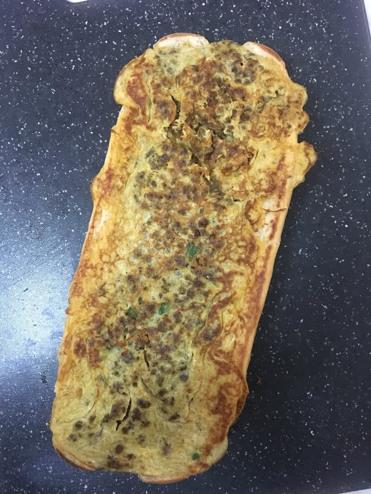 2.Panaskan kuali leper dan tuang bancuhan telur tadi. Telekupkan roti ke atas telur.